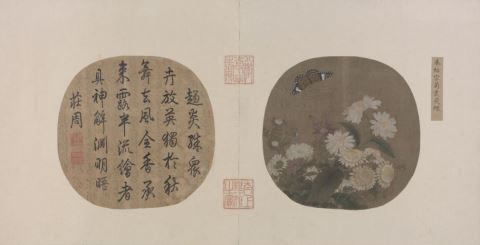 《菊丛飞蝶图》纨扇页   〔宋〕 朱绍宗   绢本设色   23.7cm×24.4cm   图绘丛菊盛开。花分黄、白、蓝、紫四色,构图繁复,灿若文锦。虽是篱边野景,却饶添富贵典雅气象。蜜蜂逐花而至,蛱蝶上下翻飞,为画面增添了动感。花瓣、叶片的勾染皆极为精工,花心用白粉点染,立体感很强,望似凸出于绢素之上。画史称作者“描染精邃,远过流辈”,信是不虚。   作者使用双勾填色的画法,造型生动准确,设色清雅富贵,一枝一叶一花一蕊,均各得其致。各品类的菊花争妍斗艳,或已绽放,或含苞欲放,相互掩映,作者以中锋勾勒,将遮挡穿插描画得生动得当。在勾画的基础上又恰当敷色,细致地表现出枝叶的向背、衰荣,花瓣颜色的浓淡变化。画面左上方的蛱蝶花纹画得尤其精彩,与紫菊半掩的那只蛱蝶不同,这只蛱蝶的花纹没有刻意勾勒,黑色的花纹与褐底晕染融合,衔接自然,其上的白色花纹用笔直接施白粉点画,自然生动地表现出鳞翅的质感。   在菊花下方,一些枝叶边缘已经开始枯黄,可知秋意渐浓,更显出这一丛幽菊清瘦萧疏的枯残之美。宋代以清雅孤高为审美取向,相较前代咏菊多侧重赞美其独立凌冰霜的耐寒品格,宋代更强调其枯而不落、不趋时而开的特点。   正如文同诗中所写:“英英寒菊犯清霜,来伴山中草木黄。不趁盛时随众卉,自甘深处作孤芳。其他烂漫非真色,惟此氤氲是正香。却念白衣谁送酒,满篱高兴忆吾乡。”此幅作者以细致的观察和描绘,表现了丛菊“趋炎殊众卉,放英独于秋”的清雅景致,实为佳作。金 撰 |