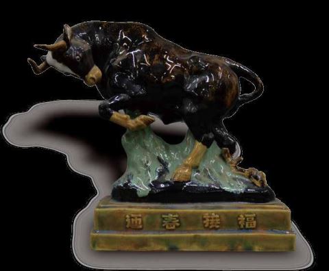 一头脚踏草地,充满力量奋力前行的黄牛塑像。牛头向左回首,左脚提起,正准备向前迈步。牛体施褐色釉,局部间黄色釉。动中有静,静中有动,展示了牛所具有的活力,具有强烈的艺术效果。造型精美,浑厚朴实,线条生动有力,釉色亮丽,形神兼备,栩栩如生。作品座前有横行楷书“迎春接福”四字。