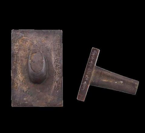 南明铜官印。印面长方形,背面有圆柱形柄。印面刻二行阳文“扬威右镇随征行营关防”篆体字。印身左侧阳刻“天字三千九十九号大使许寿造”,右侧刻“永历三十二年闰二月”。铜质精良,印文精美。