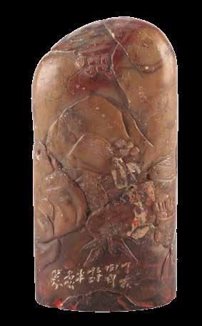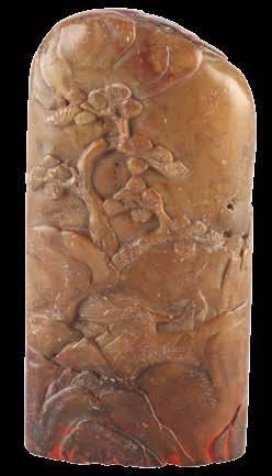 椭圆柱形,顶部呈弧形,左高右低。印面刻篆体白文“五岳归来不看山”,印身浮雕山景梅花,山之雄奇表现得淋漓尽致,与印文含意吻合。印章石质致密莹润,美观大方。