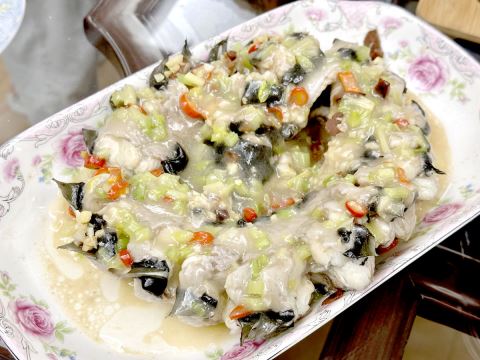 蒸制好的酸梅鳗鱼,酸梅的果香与鳗鱼的鲜甜相得益彰。入口时,先是酸梅的酸爽在舌尖散开,瞬间中和鱼肉的腥味;紧接着,鱼肉的鲜甜在口腔铺陈,每一丝肉都吸饱了酸梅汁与蚝油的复合滋味,咸淡适中,轻轻抿咬便化在齿间。