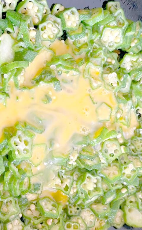3.锅中再加1匙油,油热后放入秋葵片,大火翻炒1至2分钟,再沿锅边淋入打散的蛋液,快速翻炒,让蛋液均匀裹住秋葵,形成小块蛋花;