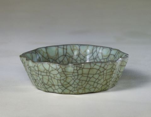 哥窑瓷器釉质凝厚、釉色沉稳,因其胎体中氧化铁含量较高,烧成时口沿处的釉熔融垂流,釉层变薄,遂隐现酱紫色胎骨。如宋时期的哥窑青釉菊瓣式盘,盘通体作14瓣菊花形,弧腹,圈足。内、外及圈足内均施灰青色釉,釉面被“金丝铁线”般开片纹所分割。足底无釉,露出黑色胎骨。中国古代艺术家和陶瓷工匠在设计陶瓷造型时,善于从大自然动、植物中获得灵感,蛙形、虎形、葵花形、菊花形等造型屡见不鲜。这件菊瓣式盘造型规整,青灰色釉素裹,交织如网的开片纹妙趣天成,堪称古陶瓷模仿花朵造型的典范。