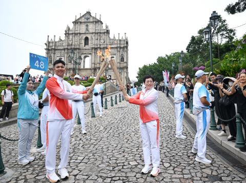 ③在澳门站,火炬手陈虹(前右)、罗协铭在传递活动中交接圣火。