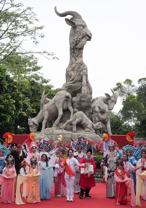 ④在广州站,火炬手李嘉宜(中)在广州越秀公园内的五羊雕像前传递火炬。