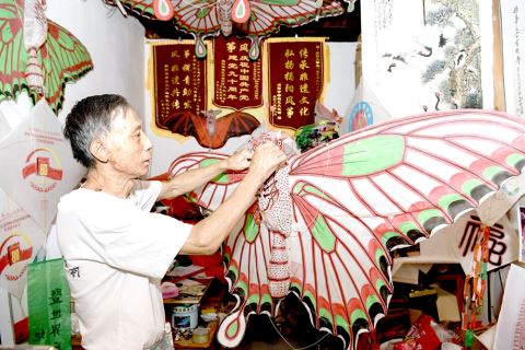他不仅在传承,更不断创新,还把国家大事和潮汕文化融入风筝创作中。2011年,为庆祝中国共产党成立90周年,薛喜乐首创了长56米、直径1米的龙头蜈蚣风筝,象征着中国56个民族大团结。这个“庞然大物”可拆卸、可折叠,收藏运输方便,这个技术后来也被很多同好仿效。之后,薛喜乐又玩出了很多“新花样”,不但创作出了会动会响的风筝,还将绘画、诗词、书法融入风筝制作中。近年来,他还尝试在风筝上加入活动部件。采访期间,他展示了独家作品“单蚕蛾(蝴蝶)”:“你看这只蚕蛾,眼睛是用小风车做的,迎风会转;下翅是半软体的,飞起来会飘动,活灵活现。”小小的风筝,在他手里越做越有文化特色,越来越有情趣内涵,简直成了活的工艺品。