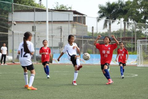 普宁市流沙东街道新坛学校女子足球队参加揭阳市第十一届学生足球比赛场面。通讯员 摄