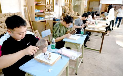 党员干部亲手拿起刻刀和锤子,体验木雕基础技艺。吴树坚 摄