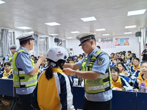 市交管市区大队法宣股吴金孟为学生们带来了一堂生动的交通安全课。课堂上,他通过案例分析、互动教学等方式,深入浅出地讲解了交通安全常识,引导学生增强自我保护意识。同时,结合中学生日常出行特点,重点讲解了“安全过马路五要诀”“骑行安全注意事项”等实用知识,并提醒学生警惕“鬼探头”“开门杀”等危险情形。在“如何正确戴头盔”互动环节中,学生们踊跃参与,在轻松氛围中掌握了“一盔一带”等重要安全常识(见图。通讯员 摄)。活动最后,普法宣讲团队还为同学们发放了《中学生道路交通安全读本》,叮嘱大家要熟记交通安全知识。