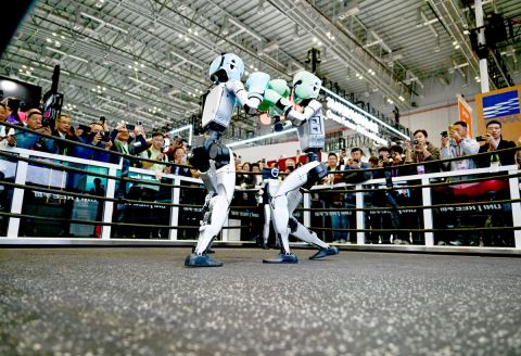 图为11月6日在第八届进博会宇树科技展台,人形机器人进行格斗表演。 新华社 发