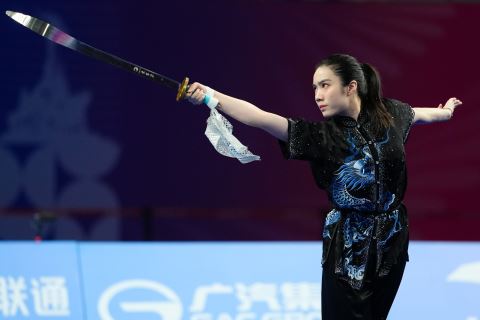 11月10日,香港队选手杨子莹在女子刀术比赛中。当日,第十五届全国运动会武术套路团体比赛在广州举行。