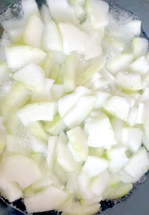 3.锅中加入适量清水,放入几片姜片,再倒冬瓜块,加水没过冬瓜就好,开火煮至冬瓜透明;