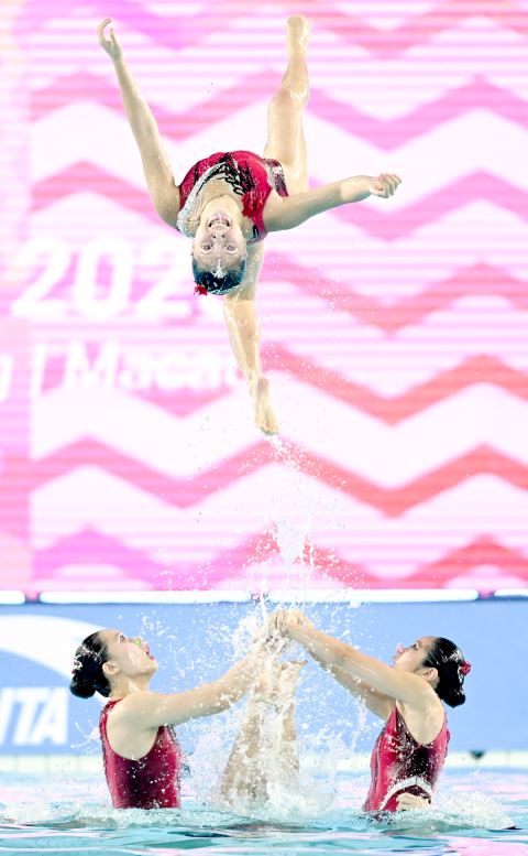 湖南“姐妹花”刘津含/刘津彤深深感受到了双胞胎在这一项目上的优势。“我们从小在一起练,发力习惯、做动作时的身体感受都很相似。很多时候,只要简单说‘往上一点’‘往下一点’,我们就能把头部、手部的角度调整到几乎一致,就连上升吸气的气口都特别同步。”刘津含说。
