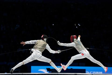 11月19日,香港队选手蔡俊彦(右)和福建队选手许杰在比赛中。当日,在香港进行的第十五届全国运动会男子花剑团体金牌赛中,香港队45比34战胜福建队,夺得金牌。 新华社 发
