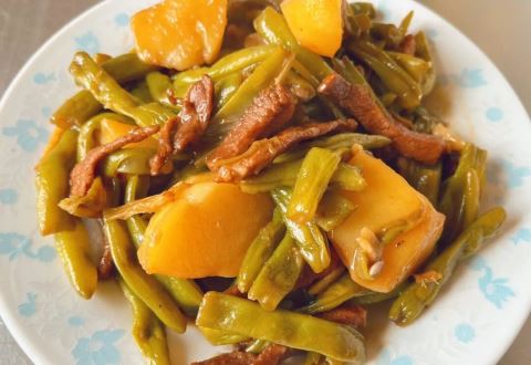 土豆富含碳水化合物、维生素C和钾元素,豆角则含有优质植物蛋白、膳食纤维及多种维生素,二者搭配能提供均衡营养,助力消化;再加入猪肉一同炖煮,成品咸香浓郁,让人食欲大开。