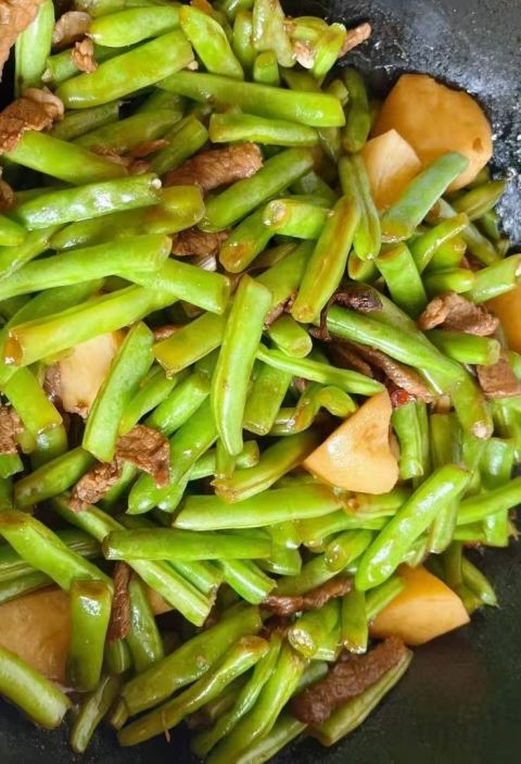 4.倒入土豆块和四季豆段,大火翻炒2至3分钟,加入盐和大料,继续翻炒1分钟,使调料均匀混合。