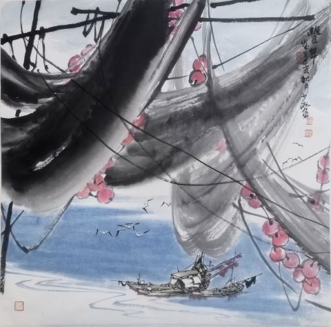 本次展览展出约100件书画作品,既彰显历史的深厚底蕴,也呈现生活的烟火气息。书法家杨烈强(汕头市书法家协会顾问)展出的作品篆、隶、行、草等书体皆有,无论是篆书“舍得”的古朴浑厚,还是草书《临江仙·滚滚长江东逝水》的气势磅礴,都是书体与内容、形式高度契合的作品。其中《小克鼎》《觚》《虎符》等系列作品尤为引人注目,书法家创造性地将青铜器文化与书法艺术结合,形成“器物+文字+考据”的独特表达形式。他通过深研青铜器的历史脉络与文字内涵,以水墨描绘青铜器,金文书写器物铭文内容,并附考据释文,形成“一图一史”格局,令观者了解文物承载时代印记,感受书法活化历史的当代价值。杨烈强说,研习书法临摹青铜器铭文时,他尝试绘入器型、题跋器物渊源与铭文释义,创作出 系列作品并结集,让作品兼具观赏性与考据价值。受友人鼓舞办展,身为揭阳人且曾在此履职的他,决定将首展设于家乡,以作品传承中国青铜器历史文化。画家郑少洲(广东省美术家协会理事)国画作品人物、山水、花鸟皆有,其笔下戏曲人物画堪称“戏画合一”的范本,作者依据戏曲主题捕捉经典场景、角色,以“兼工带写”、大写意以及夸张造型等多样表达手法,创作形神兼备、情感张力与民俗意蕴,且风格迥异的戏曲人物画《喜洋洋》《比翼双飞》等。其山水画极具个人绘画语言,在传统笔墨基础上融汇现代视觉经验,于平凡景致中发掘诗意。画家绘写的滨海之景,大胆运用泼墨、破墨之法,或间以细线勾勒渔民、渔舟、海鸟,或鲜亮设色点染其间,画作极具现代构成感,令人耳目一新。郑少洲说,作为一名文艺工作者,他将弘扬乡土文脉视为责任与担当。创作中,他以潮汕三市的人文风物为题材。技法运用上,采用 “因景而变、因意择法”,以传统笔墨为载体,用最贴合意境的表现形式,于尺幅之间见天地、于细节之处见精神,让潮汕文化通过作品直抵人心。