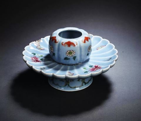 菊蝶盏托。盏托名茶托,是一种置茶盏的承盘。宋人吃茶要经过“打拂”,用茶筅搅动、敲击茶汤,盏托是为了防止烫手而设计的。天蓝釉菊蝶盏托。盏托为菊瓣形,通施天蓝釉。托口高凸,外形作扁圆棱瓜状,中空。托盘浅平,边缘弧起作菊瓣状,盘面有与之对应的凸棱。高圈足,直壁,下端外撇。托口外壁上部施一周红彩蝙蝠纹,其下施一圆黄白色菊花纹。托盘表面施一周蝴蝶菊花相间的蝶舞菊花纹,圈足外施一周缠枝花卉纹。天蓝釉属于低温釉,由天青釉演变而来,清康熙时创烧,釉色均匀柔和,浅而发蓝,透亮感强。此器器形雅致,釉色莹洁菁雅,纹饰灵动,十分秀美。
