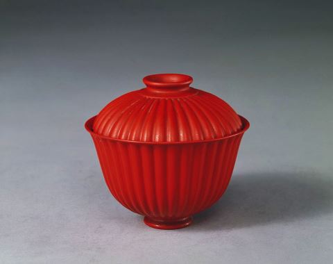 菊瓣盖碗。盖碗是融合茶杯与茶壶之长的茶具,其设计独具匠心,上有盖、下有托、中有碗,既可单独泡茶饮用,又可分茶至品茗杯中供多人共饮。清乾隆脱胎朱漆菊瓣式盖碗,藏于北京故宫博物院。碗身通体作菊瓣形,敞口略向外撇,边缘如菊瓣外展的弧度,承以矮圈足。圈足虽矮,却让整器立得端庄,仿佛是将秋日最饱满的菊花凝固成了实用之器。附菊瓣形盖,盖面隆起,盖顶置圈形抓钮。盖内以金彩署乾隆御制诗一首:“制是菊花式,把比菊花轻。啜茗合陶句, 浥露掇其英。”诗句简洁雅致,既点出器物造型的精妙,又将啜茗的闲逸与陶渊明采菊的意境相融。外底署金彩篆体“乾隆年制”四字双行款。碗内外通施仿朱漆釉,色泽如熟透的朱砂。漆层薄如蝉翼,光滑如镜,是脱胎工艺特有的轻盈质感,藏着皇家造办的极致巧思与文人意趣的交融。