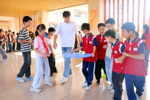 活动中,六大趣味心理项目有序开展,各环节设计紧扣“寓教于乐”理念,让学生在实践中收获成长。比如,在“合力建塔”项目中,学生们通过肢体语言与眼神默契配合,快速调整搭建策略,锻炼团队策略规划与问题解决能力。在 “蒙眼敲锣”项目中,学生们通过倾听与信任完成挑战。在“四平八稳”项目中,学生们手持道具托住小球前行(见图。通讯员 摄),充分考验了他们的专注力与心态稳定性……激烈的竞争氛围激发了学生的参与热情,现场加油声此起彼伏。活动全程,工作人员与心理教师分组守护,及时调整项目难度、疏导学生情绪,在轻松实践中帮助学生提升心理素质,切实落实送教下乡的教育帮扶实效。参加活动的学生纷纷表示受益匪浅,小陈说:“以前我不敢和同学说话,但‘蒙眼敲锣’时队友一直鼓励我,现在我觉得沟通没那么难了。” 城东中学心理教师陈加乐表示:“活动设计注重实践性与趣味性结合,学生从拘谨到主动投入的过程,正是心理赋能的体现。”
