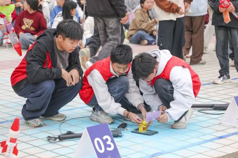 在科技竞技环节,现场气氛十分热烈。该环节按年级设置,初一年级的无人机竞速接力赛紧张刺激,选手们灵活操控无人机穿越障碍;初二年级的机甲遥控车竞赛考验速度与精准控制;最引人注目的是初三年级的水火箭限时制作与竞技比赛。参赛团队在有限时间内协作完成从领取材料、学习原理到动手组装、调试发射的全过程。当一支支水火箭成功升空,现场响起阵阵欢呼。参赛学生感慨:“亲手将瓶子变成火箭发射出去,特别有成就感,也真正理解了反冲力的原理。”