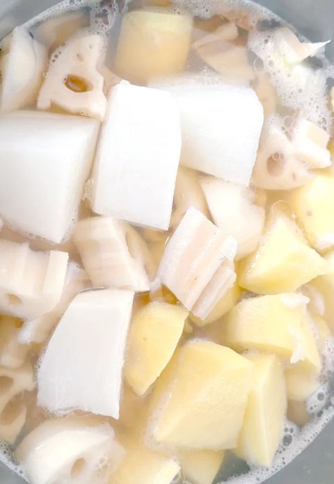2. 莲藕洗净削皮,切成大小均匀的滚刀块;土豆和白萝卜同样处理,切成与莲藕相似的滚刀块(避免炖煮时大小不一导致成熟度不均)。