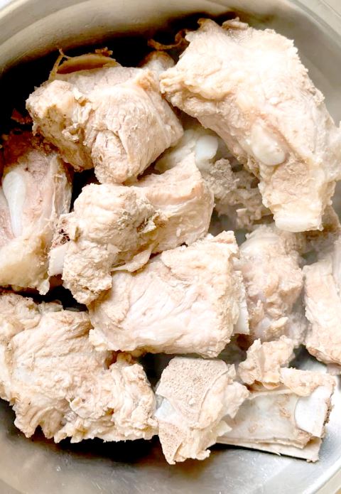 1. 排骨洗净,放入冷水锅中焯水,水沸后撇去血沫,捞出后用温水冲净,沥干备用。