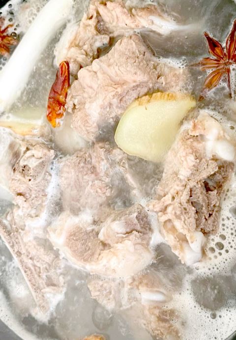3.锅中加入足量温水,放入排骨,再放入葱段、姜片、八角、干辣椒,淋入少量白酒(或料酒)去腥味,大火烧开后转小火煮5分钟,再次撇净锅中残留的浮沫,确保汤汁清澈。