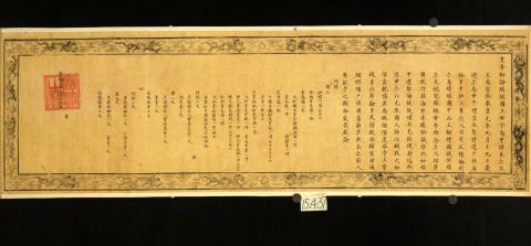 这次展出的“明谕琉球国王敕”系仿制品,原件存放于旅顺博物馆库房。敕谕落款为明崇祯二年(公元1629年),为黄色纸本,四周有金色云龙花纹,钤有“广运之宝”朱文方印,行文采用工整的楷书。