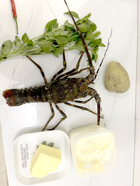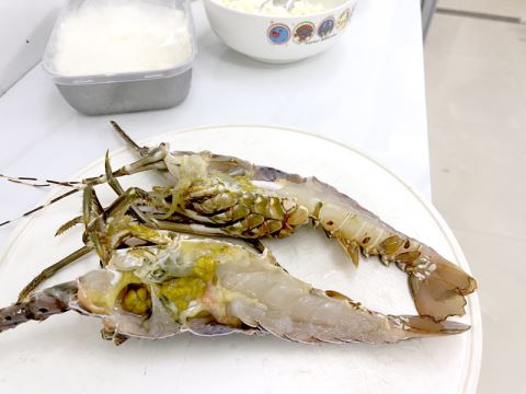制作的第一步是龙虾的精细处理。用刷子将龙虾通体洗净,剪去虾鳃和细小步足,从虾尾中间下刀对半切开,用刀尖挑出虾肠,既方便入味与食用,也能为芝士土豆泥打造完美的“承载容器”。处理好的虾身用白葡萄酒和蒜末腌制10分钟,既去腥又提香。