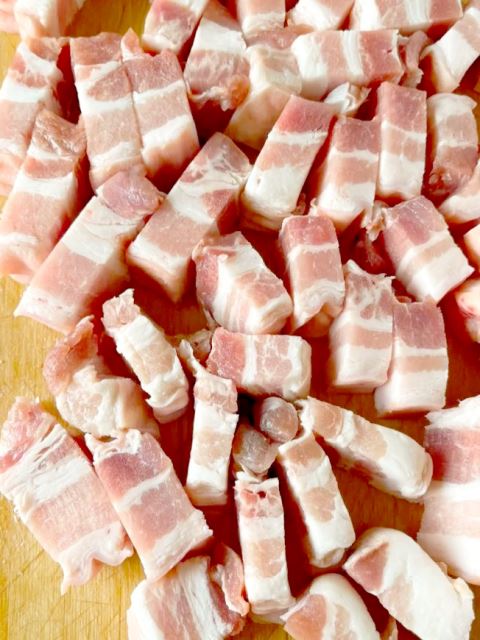 1.将五花肉切成大小适中的块状,焯水去腥,捞起并沥干水分备用。鲜海带先泡水,洗净后焯水,再切成大小适中的块状;