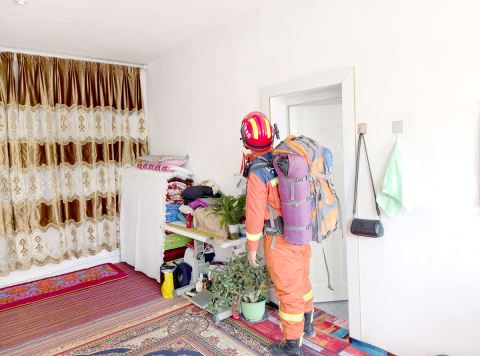 图为12月4日新疆阿合奇县消防救援人员在库兰萨日克乡吉勒得斯村入户进行探查。