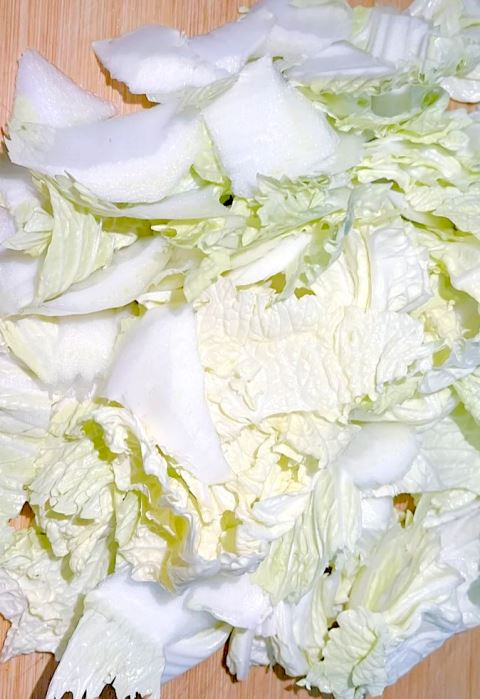2.大白菜洗净,切成大块;生姜、大蒜切末;水淀粉提前搅拌均匀备用;