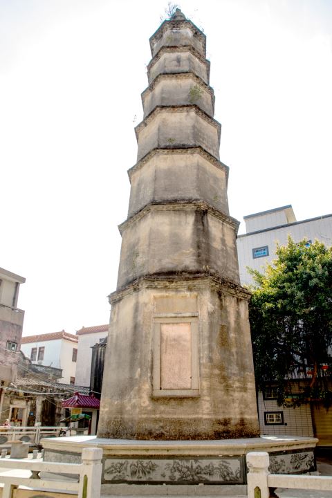 玉华塔为八角七层贝灰沙夯筑实心塔,高约27米,塔门向西北。每层塔檐叠涩而出,线条交错有致。塔尖葫芦顶与塔身缝隙间,野榕盘根错节,绿叶披离,为古塔平添一抹不息的生命力。