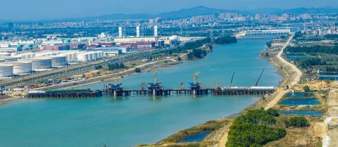 据介绍,跨龙江河大桥总长约1.2公里,其中桥梁长489米,设计为双向六车道。桥梁段总宽32米,主桥采用连续刚构体系,引桥为40米预制小箱梁先简支后连续结构。工程涵盖道路、桥梁、交通、管线、照明、景观绿化等设施。该项目自2024年6月开工以来,迅速推进,拟于2026年实现全桥贯通。项目建成后,将联通大南海石化工业区河东、河西两大产业组团,破解龙江河阻隔导致的物流瓶颈。河西区的石油炼化、精细化工等产业可直连河东区的公共码头。此外,大桥将与南海大道、揭阳港公共码头共同构成园区“路港联动”体系,为粤东打造世界级绿色石化产业基地注入强劲动力。 |