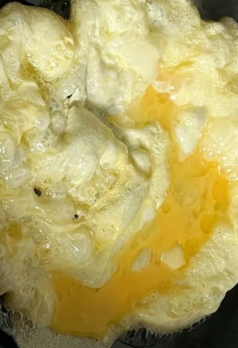 3.起锅热油,油热后倒入蛋液,待底部定型后用筷子戳碎,炒至金黄蓬松时立即盛出备用;