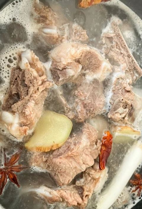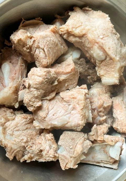 1.排骨洗净后冷水下锅,加1片姜和1勺料酒,大火煮沸焯去血沫,捞出后用温水冲洗干净,沥干备用;