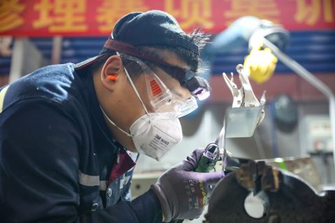 12月19日,参加日照市技师学院第14届技能文化节的选手在进行车身修理项目比赛。山东省日照市近年来不断推进技能人才队伍建设,把职业技能竞赛作为培养高素质高技能人才的重要途径,坚持以赛促学、促教、促训,将技能培训、岗位练兵和技能竞赛相结合,促进就业、创业。 新华社 发