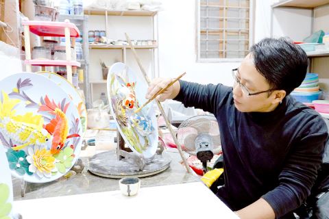 陈伟钦正在创作嵌瓷摆盘。