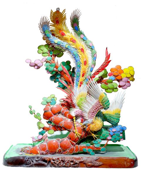 嵌瓷之美,源于极致的手工。这门技艺没有标准图稿可依,全凭艺人心中丘壑、手上功夫。其制作工序繁复精微,环环相扣:首先是“塑胚”,也叫缚瓦骨。用铁丝扎出骨架,再用灰泥塑出基本形体,如同绘画的草稿。随后进入核心的“剪瓷”与“镶嵌”阶段。匠人需依据构思,用特制钳具将彩瓷碗盘剪裁敲制成特定形状——细如发丝的叶脉、薄如蝉翼的羽翼、弧度刚劲的铠甲,皆出自这“咔嚓”脆响之间。镶嵌,也叫“贴饶”,匠人要有一定的造型和色彩基础,这一步基本决定了作品的档次、水平。作品成形后,还需从整体构图的“配色”“层次”“疏密”,以及人物的“动态”“造型”等作进一步的调整。在湿润的灰胚上,将成千上万片瓷片逐一镶嵌、粘接、调整,从骨架到肌理,从神态到气韵,全凭匠人的巧手匠心赋予泥胎以鲜活生命。