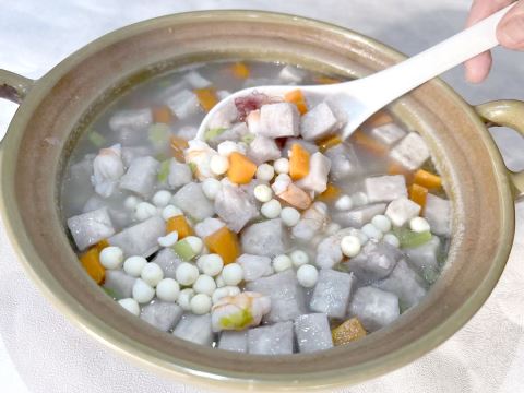 掀开砂锅锅盖,一股绵密醇厚的香气便裹挟着热气扑面而来,瞬间驱散冬日的寒凉。吸饱了高汤精华的香芋泛着温润的米白色,颗颗饱满弹润的芡实点缀其间,萝卜的嫣红与芹菜粒的翠绿相映成趣,丰富了视觉层次。