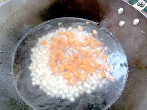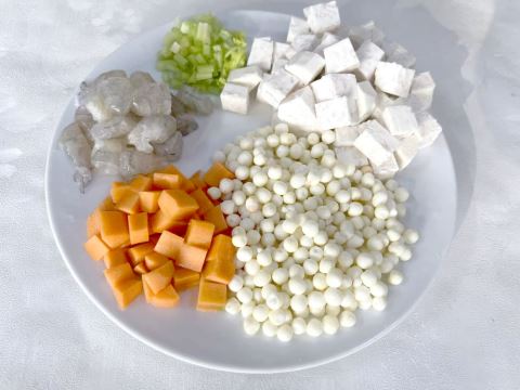 预处理不可马虎:芡实提前解冻后洗净,用清水浸泡10分钟软化;鲜虾去壳去虾线,切成均匀虾粒;香芋去皮后切成小丁,放入清水中浸泡以防氧化变黑;红萝卜洗净后切成丁,芹菜去叶后切成碎粒。