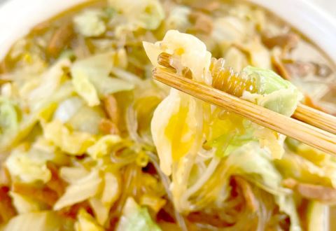 白菜猪肉炖粉条做法简单,炖好后白菜吸满肉香,粉条裹着汤汁,暖身又下饭。