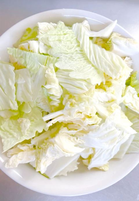 1.大白菜洗净后,撕成大块;五花肉切薄片;粉条用温水浸泡15分钟,泡至变软但仍有韧性;