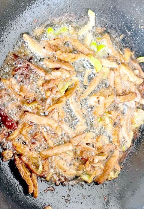 2.热锅凉油,油热后放入五花肉,中小火煸炒至出油、边缘微焦,盛出备用;