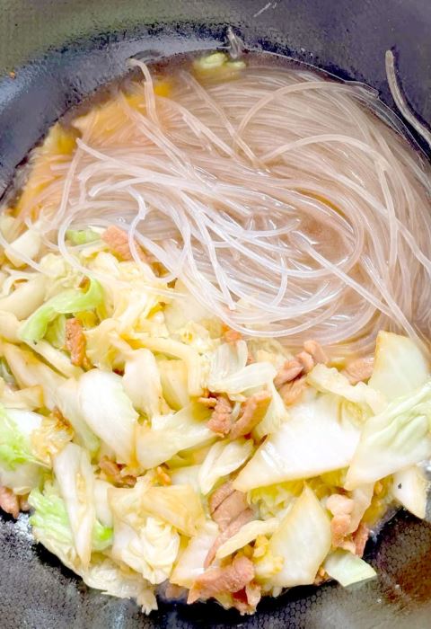5.加入没过食材的温水,大火烧开后转小火,放入泡软的粉条,加盖炖煮8~10分钟;开盖加入盐、白胡椒粉调味,大火收汁至汤汁浓稠裹住食材,即可关火出锅。