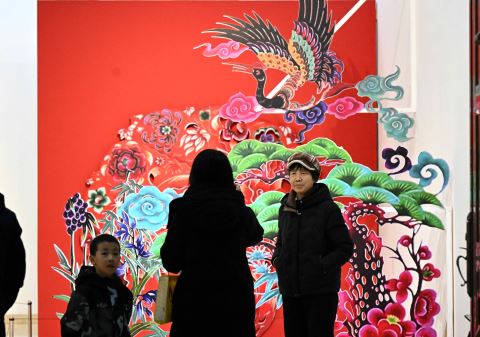 12月27日,参观者在石家庄市美术馆“生生复象” 年画艺术展上留影。近日,“生生复象” 年画艺术展在河北省石家庄市美术馆开展,让参观者在浓郁生动的“年味”中感受年画、剪纸等民间艺术魅力。 新华社 发