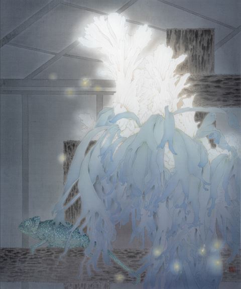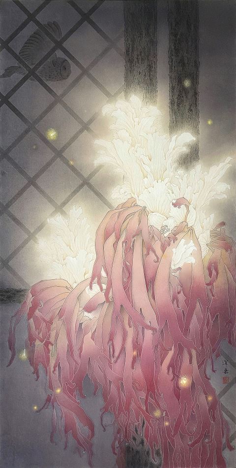 在着色方面,作者遵循“三矾九染”。背景设色以蓝紫、青绿为基调,画面空间以梦幻、纵深为基石,以绢帛的湿润与柔和为肌理,其用层层晕染及提白技法,保持了色调的和谐统一,物象的真实,又强化画面的光影效果。这种“雅淡而不失层次,艳丽而不失含蓄”的设色风格,是传统技法与现代观念的融合。使画面色彩在不同光线和角度下产生微妙变幻,时而如深海,时而如暮空,每一丝褶皱都透着“落花烟重”的朦胧。