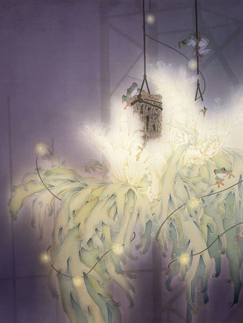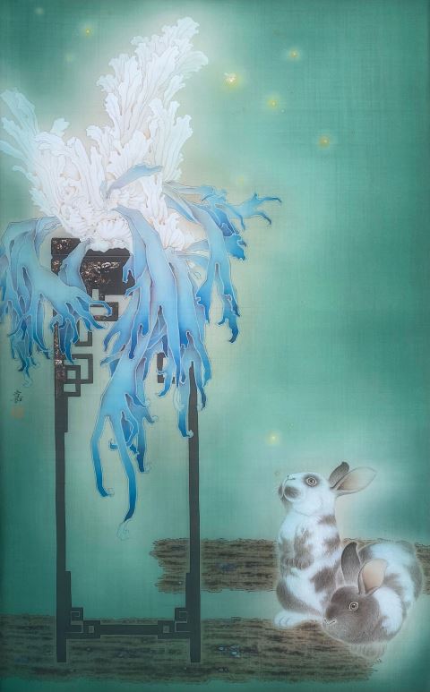何泽嘉以超凡的胆识与功底,以传统技法为骨,以现代审美为魂,构筑一个生机盎然的光影秘境,描绘出一个充满暖意的世界。在材料选择上,他采用绢本设色这一传统形式,以虚实相济的构图,蕨影婆娑,玉兔仰卧,变色龙轻捷,树蛙静伏,描绘出的画面既似苏轼案前“清夜无尘,月色如银”的澄澈,又似唐温如笔下“醉后不知天在水,满船清梦压星河”的迷离,把诗词的缥缈定格于绢素之上。