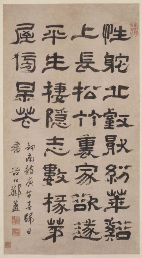 此轴书法用笔厚重,结字稍扁。郑簠隶书到晚年产生了一些细微的变化,尤其在用笔上少了一些轻灵飘逸而增加了沉实厚重的气息,特别是一些出挑的用笔变化较大,结字也更加紧凑,在汉隶的基础上求新求变,反映了郑簠弥老弥坚的艺术追求。此轴曾藏清代中期著名书法家伊秉绶处,伊氏也为隶书名家。